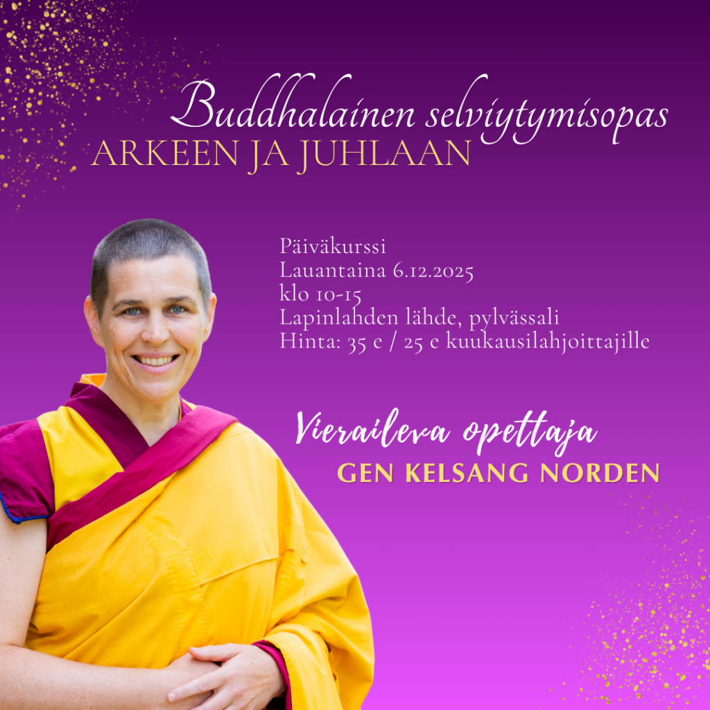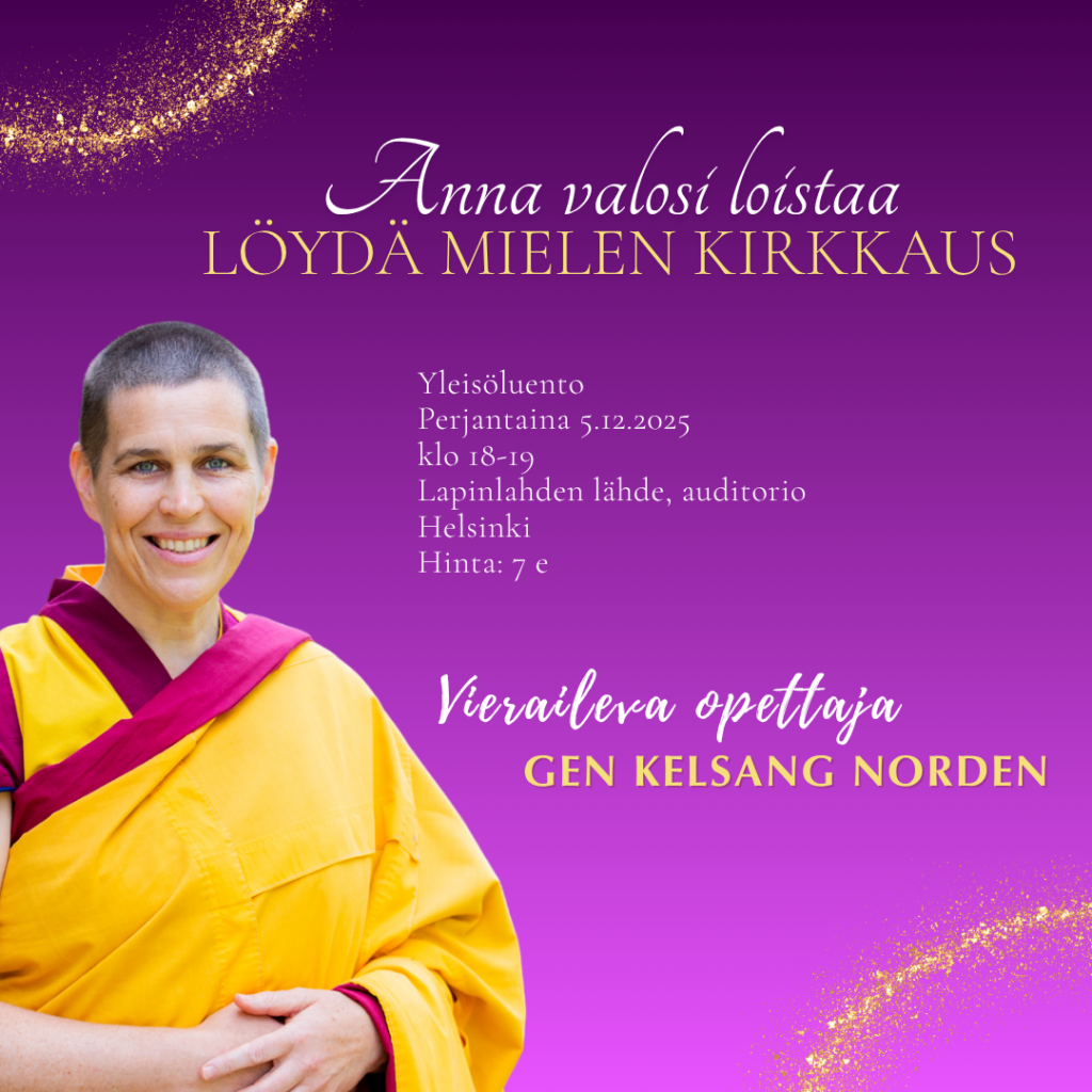 Opettajamme Gen Kelsang Nordenin suositut yleisöluennot jatkuvat Helsingissä! Hän on buddhalainen nunna ja Suomen kadampameditaatiokeskuksen pääopettaja. Hän vierailee luonamme Englannista muutaman kerran vuodessa.
